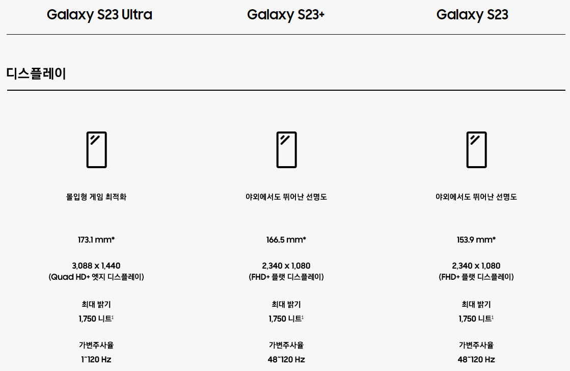 - 가변주사율 : S23울트라(1"120Hz) > S23+/S23(48"120Hz)