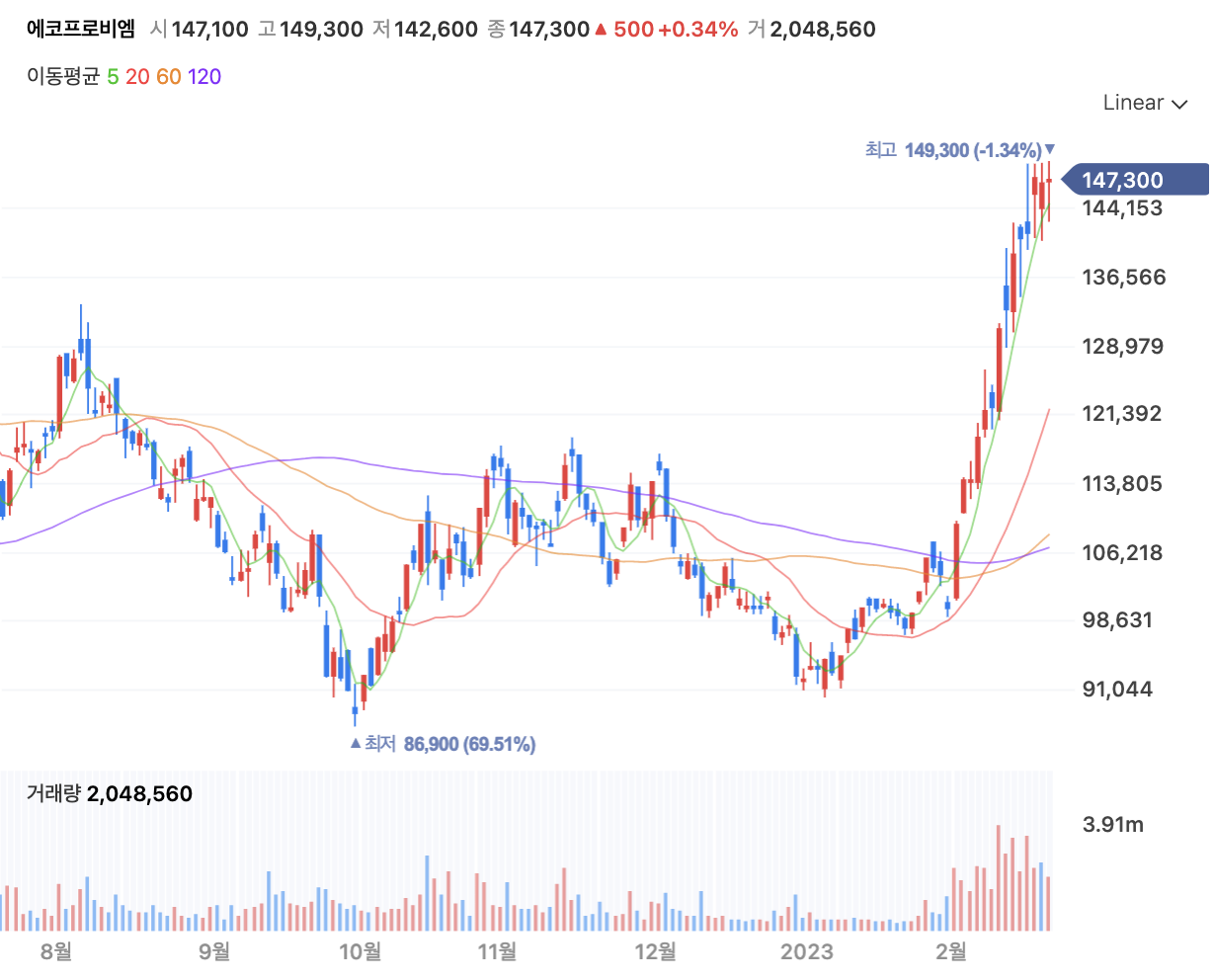 에코프로비엠 주가는 현재 (2월 20일) 기준 147,300원에 있습니다. 2월부터 10만 원 대 이던 주가가 가파른 상승을 하고 있습니다. 바닥부터는 무려 50% 이상 상승한 것을 보실 수 있습니다. 현재는 약간의 정체 구간에 있어 지금이 꼭대기라면 차익 실현을 해야 할 수 도 있고 아니면 앞으로 더 상승할 가능성도 있기에 주주분들이 많은 고민을 할 것으로 예상됩니다.